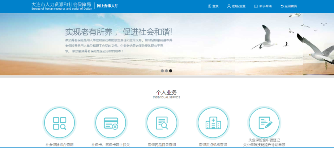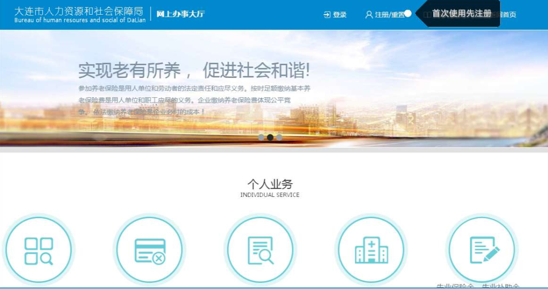 步驟一:失業人員本人通過計算機登錄大連市人力資源和社會保障局-網上辦事大廳→個人業務(網址:http://bsdt.dlyun.work/personal.jsp