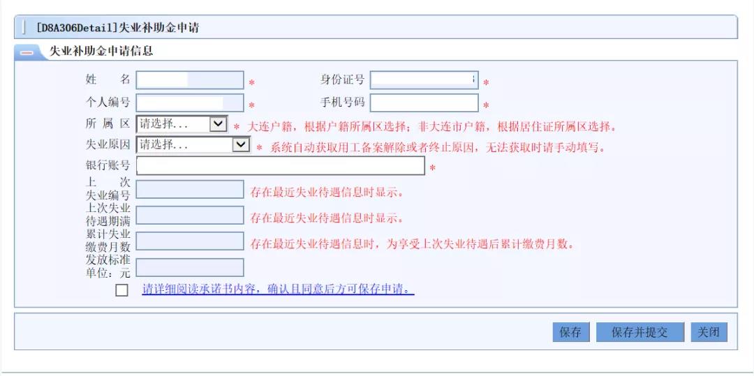 步驟四:點擊失業補助金申請模塊,系統自動獲取社會保障卡號,錄入個人基本信息(填報信息里帶*號的必填,不帶*號的不用填),簽訂申領失業補助金承諾書,在確認無誤后按保存并提交 鈕上傳申領數據。如持有承載失業保險待遇發放的八家銀行(工商銀行、農業銀行、中國銀行、建設銀行、交通銀行、大連銀行、郵政儲蓄銀行、農商銀行)的社會保障卡,需先到社保卡發卡銀行開通社保卡金融功能(開通后五個工作日后再申請)確保正常領取失業補助金待遇。如持有其他銀行的社保卡則需錄入大連銀行卡號申領。
